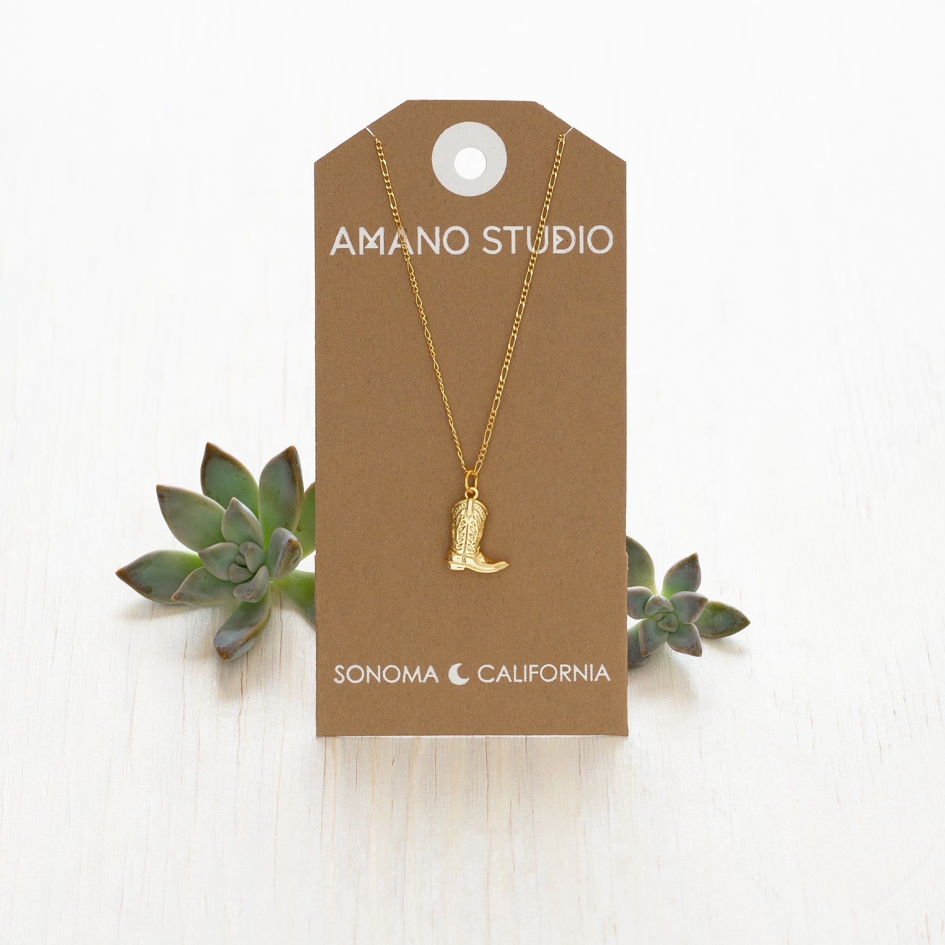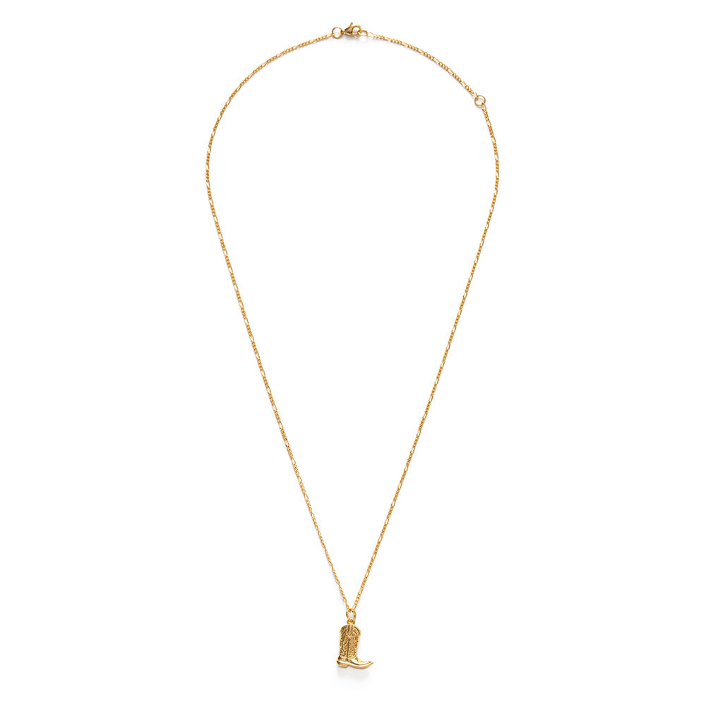 We have a new addition to our Western Desert Collection: the cutest 1cm cowboy boot with amazing detail hangs on 20" figero chain. All made from 14k gold plated brass + coated to resist tarnish. Designed and assembled in our Sonoma California studio.