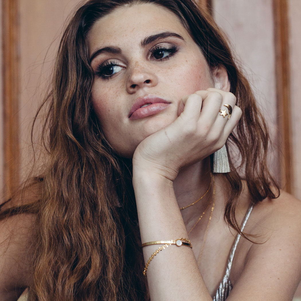 6mm mother of pearl cabochon set on an adjustable matte gold hammered cuff. A great addition to a bracelet stack and a sweet statement all on its own.