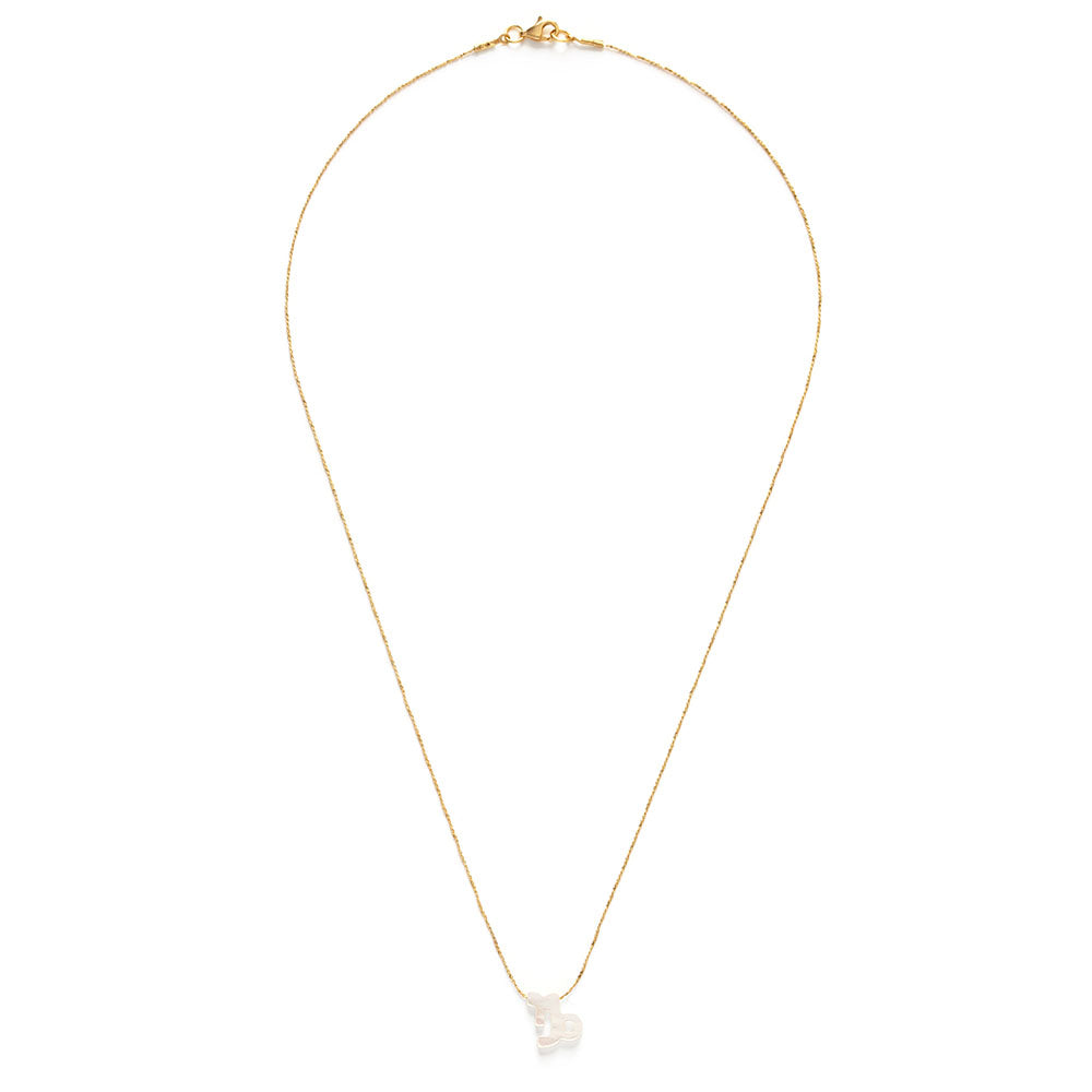 Mother of Pearl, 14k gold plated brass chain + coated to resist tarnish and create a hypoallergenic surface.
