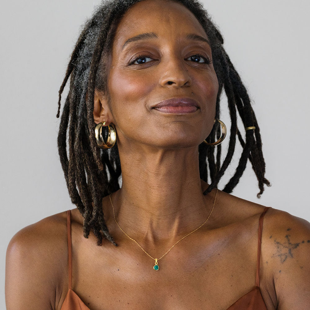 sapphire, 14k gold plated brass chain + coated to resist tarnish