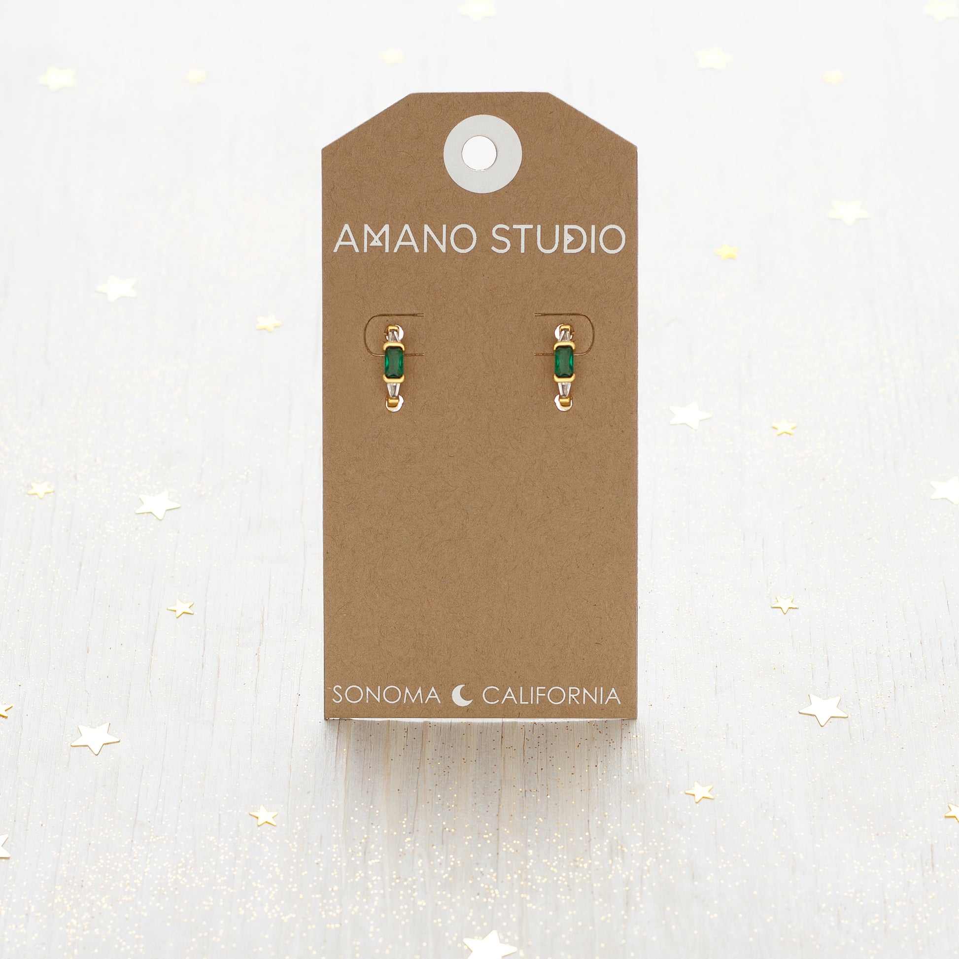 Precious little 15mm huggie hoops with dazzling baguette crystal "stones" and emerald green center "stone" - perfect for the holidays! Made of 14k gold plated brass, lead and nickel free. These are a great stacking piece.