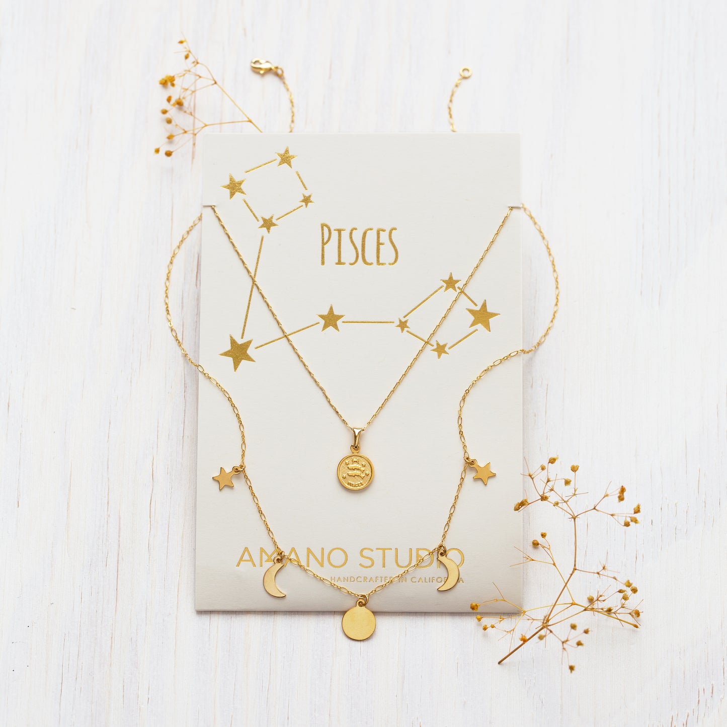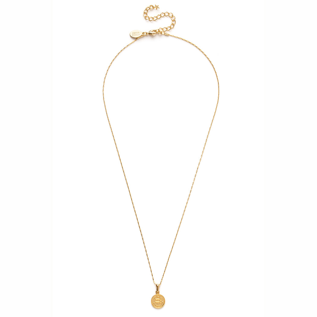 Tiny 3/8" zodiac medallion on 16" chain with 2" extender. Made of brass with a 14k gold plate. Delivered on a gold embossed letterpress card.