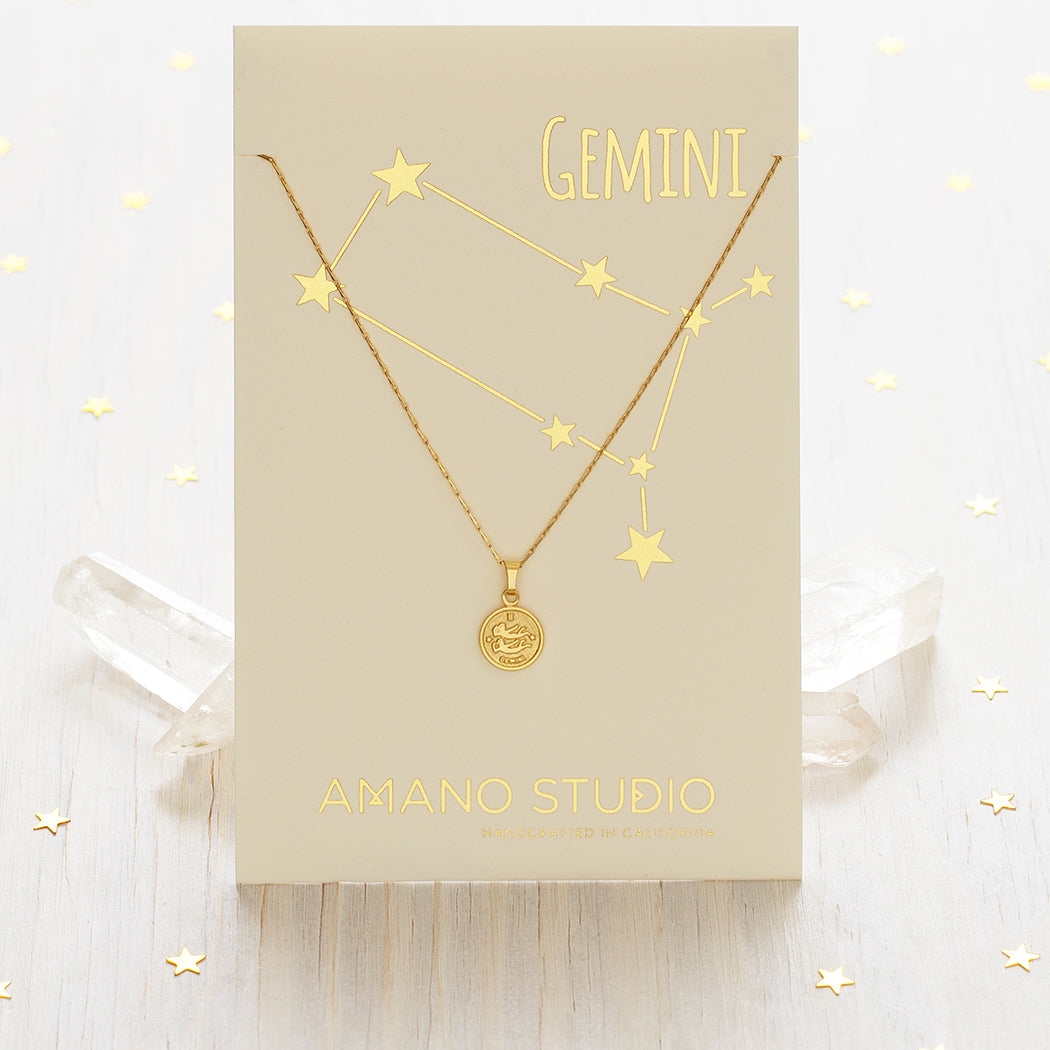 Tiny 3/8" zodiac medallion on 16" chain with 2" extender. Made of brass with a 14k gold plate. Delivered on a gold embossed letterpress card.