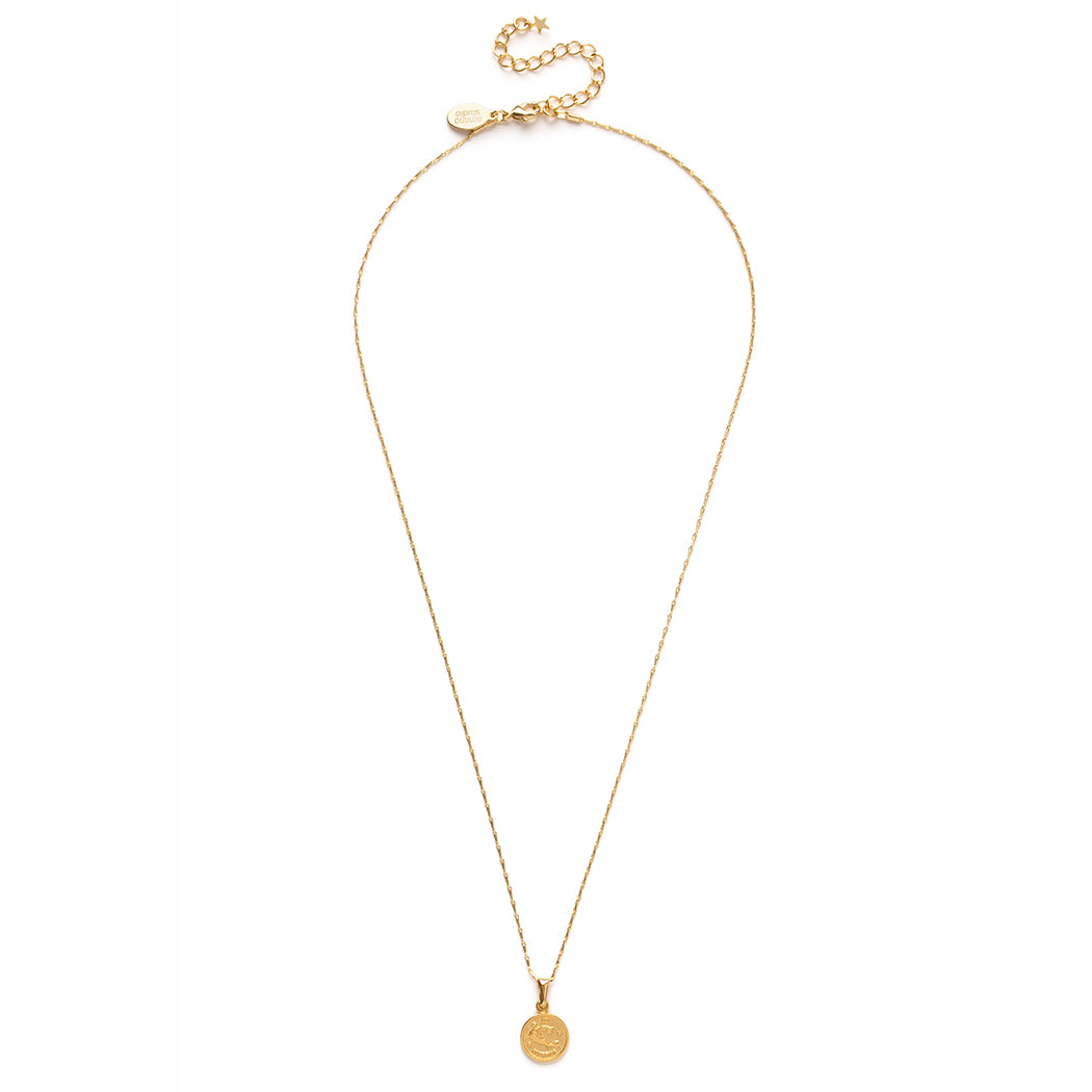 Tiny 3/8" zodiac medallion on 16" chain with 2" extender. Made of brass with a 14k gold plate. Delivered on a gold embossed letterpress card.