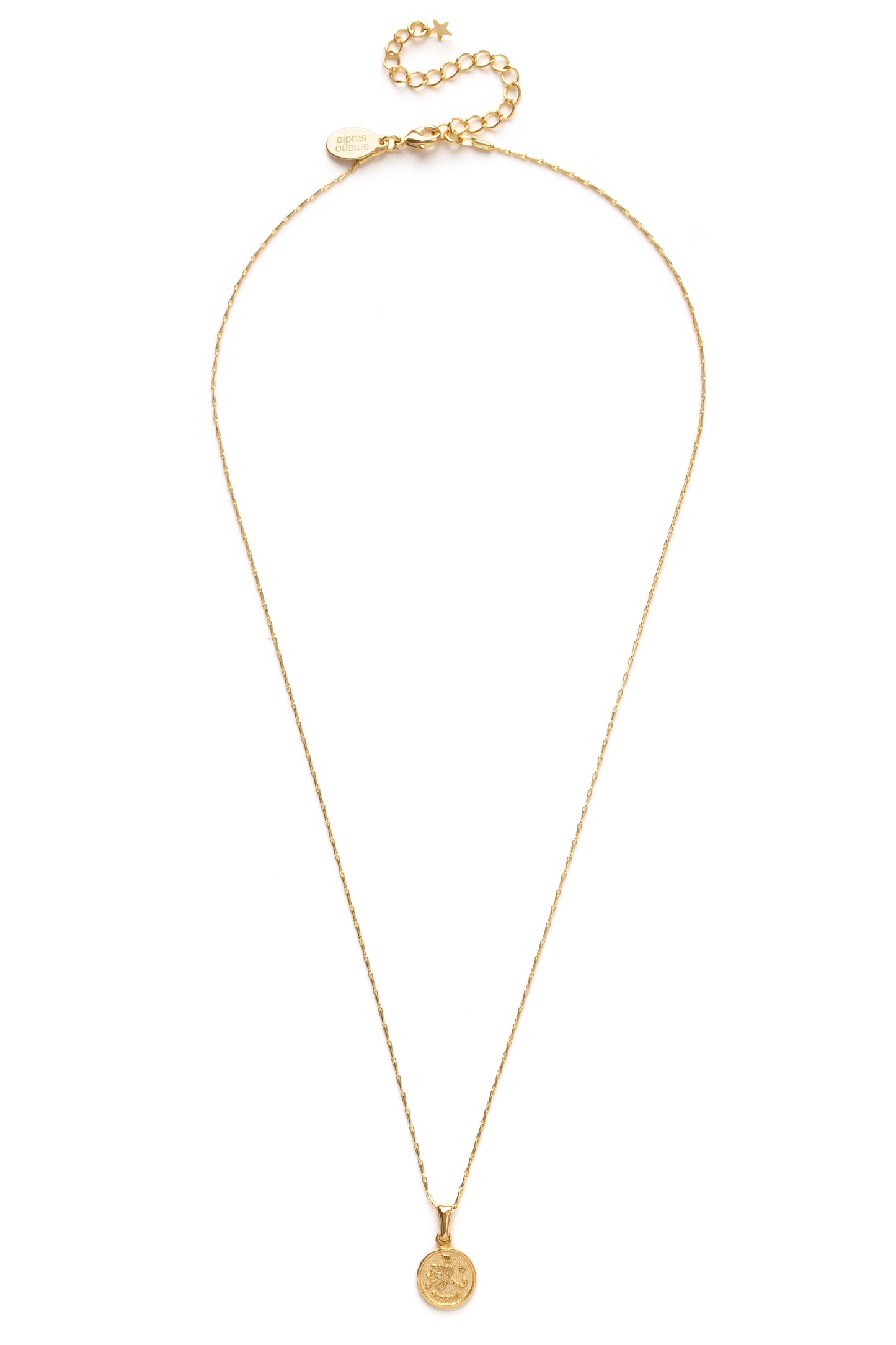 Tiny 3/8" zodiac medallion on 16" chain with 2" extender. Made of brass with a 14k gold plate. Delivered on a gold embossed letterpress card.