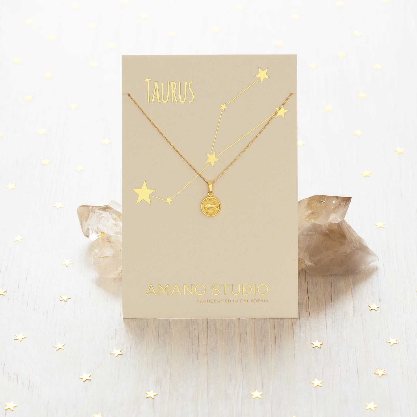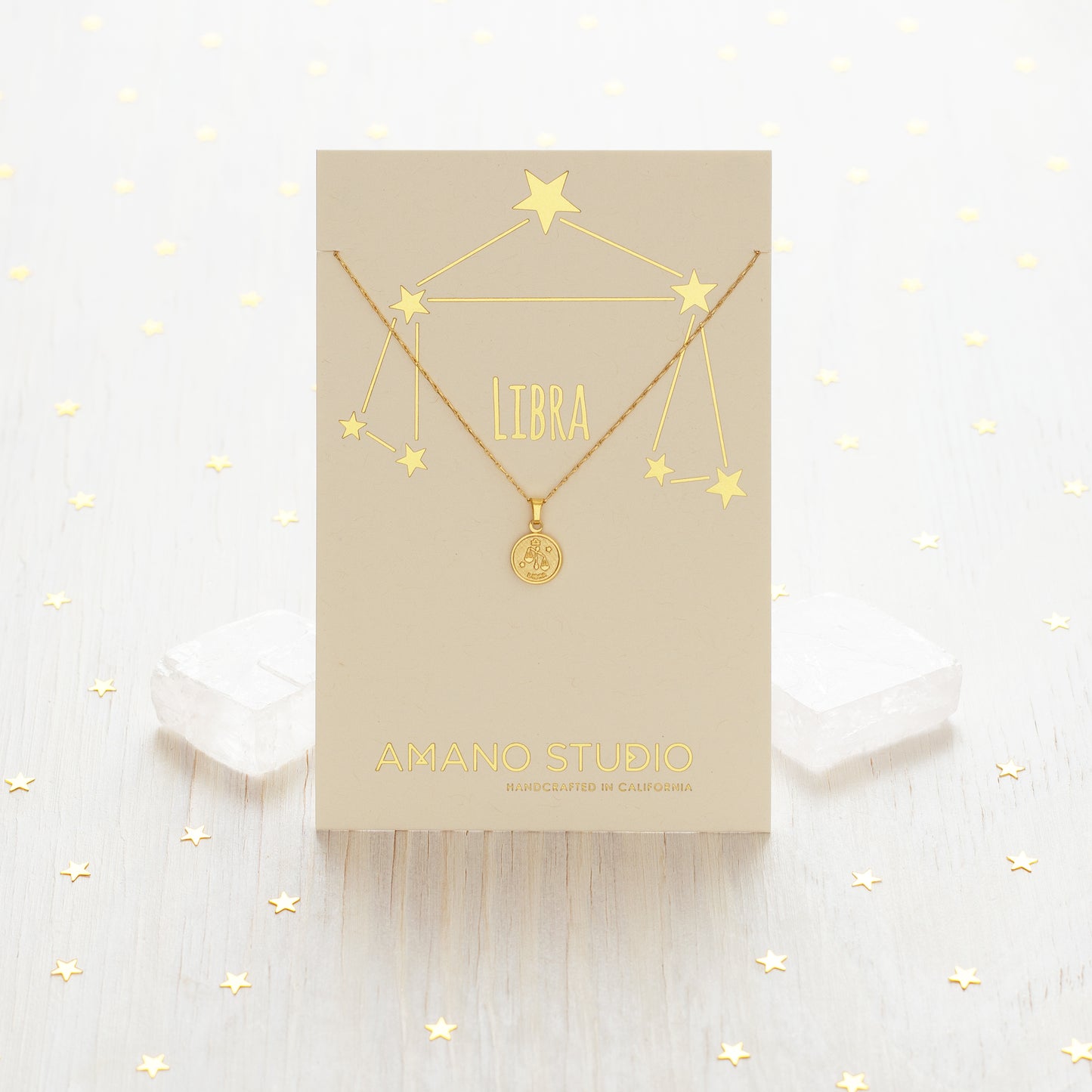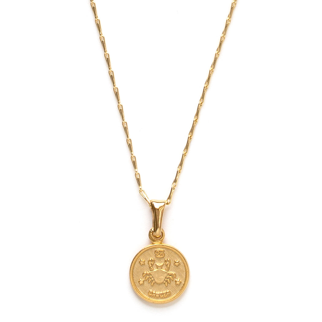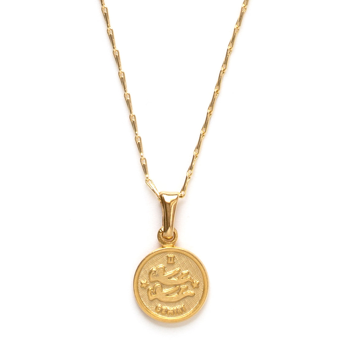 Tiny 3/8" zodiac medallion on 16" chain with 2" extender. Made of brass with a 14k gold plate. Delivered on a gold embossed letterpress card.