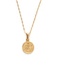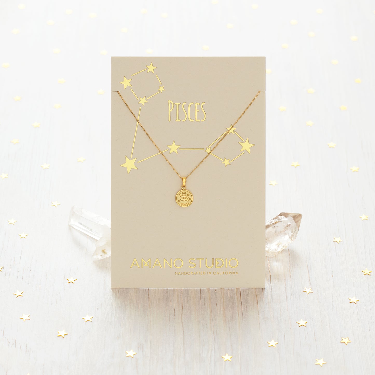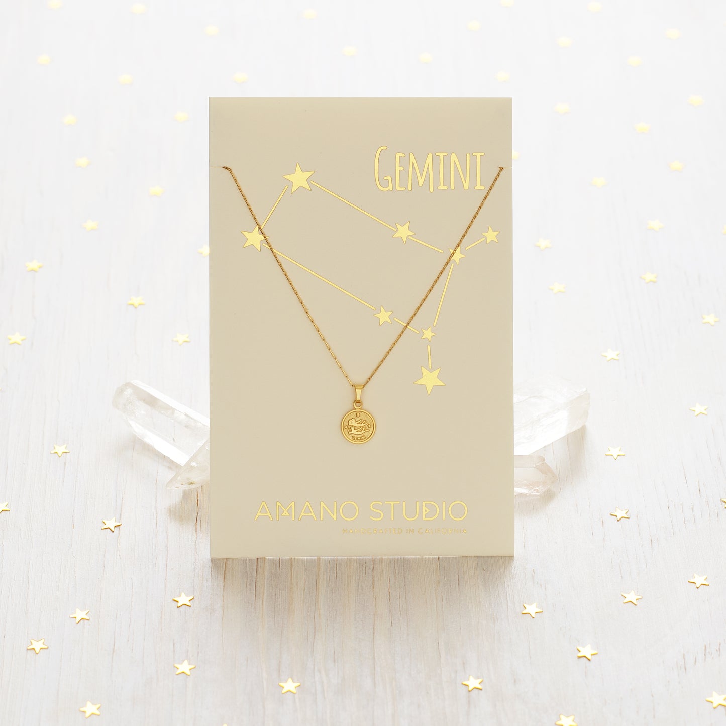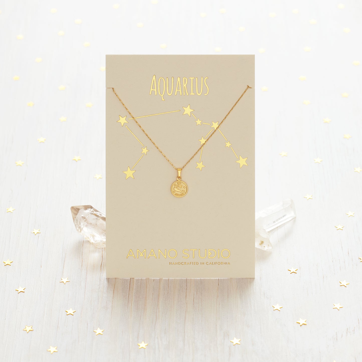 Tiny 3/8" zodiac medallion on 16" chain with 2" extender. Made of brass with a 14k gold plate. Delivered on a gold embossed letterpress card.