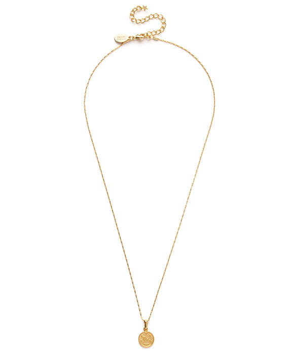 Tiny 3/8" zodiac medallion on 16" chain with 2" extender. Made of brass with a 14k gold plate. Delivered on a gold embossed letterpress card.