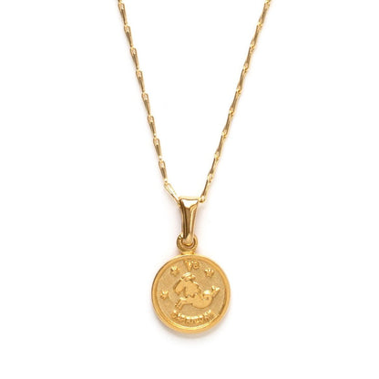 Tiny 3/8" zodiac medallion on 16" chain with 2" extender. Made of brass with a 14k gold plate. Delivered on a gold embossed letterpress card.